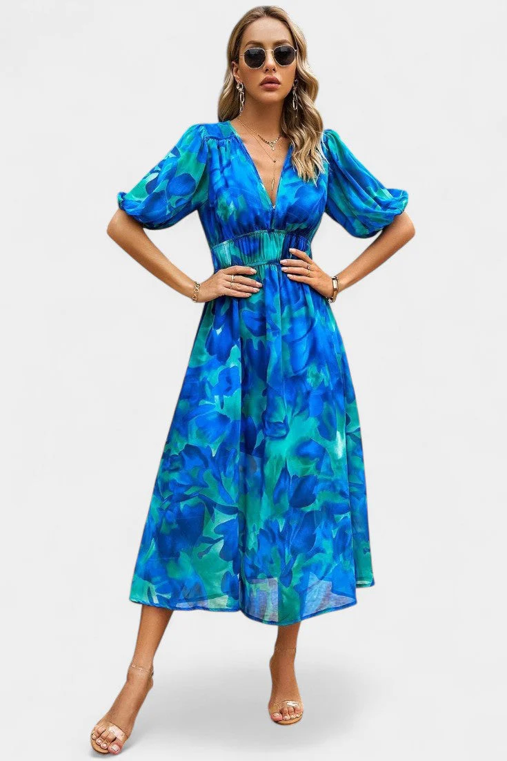 Romantic and Classic Details: Puff sleeves, a V-neckline, and soft floral print bring elegant femininity that never goes out of style.